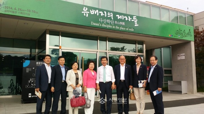 최근 서울 강동구의회 새정치민주연합 소속 의원들이 목민관으로써 올바른 자세를 배우고 더 나은 의정활동을 펼치기 위해 다산 정약용의 생가를 방문해 민본사상의 근원을 배우고 느끼는 시간을 보냈다. 사진은 실학박물관 앞에서 기념촬영한 성임제 의장(오른쪽 네번째)과 의원들의 모습.(사진제공=강동구의회)