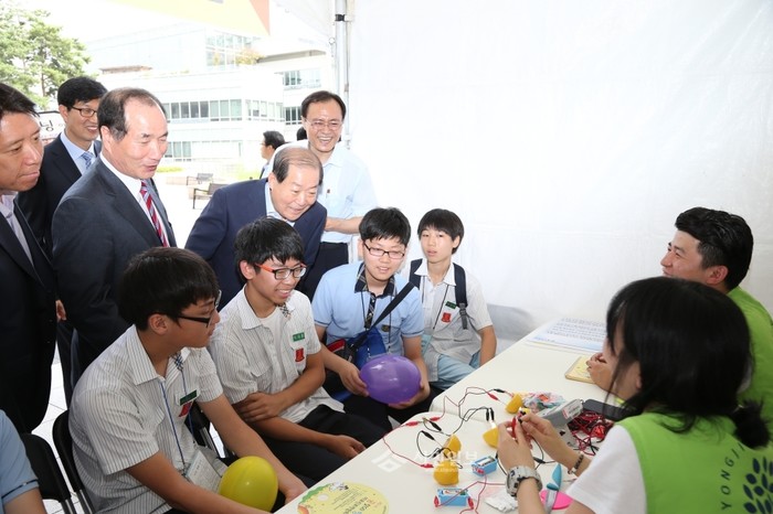 지난 17일 서울 마포구는 구청에서 지역내 중학생 2000여명이 참여한 '마포진로박람회'를 개최했다. 사진은 이날 행사에 참가한 박홍섭 마포구청장이 청소년들에게 상담을 해주는 환경에너지 공학 직업체험 부스를 둘러보고 있는 모습. (사진제공=마포구청)