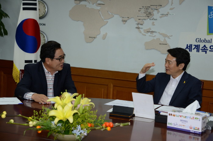 | ▲김선교 경기 양평군수는 22일 오전 경기도청을 방문해 남경필 도시사와 면담을 갖고 군에서 추진하는 각종 사업의 필요성과 당위성을 설명하고 도 차원의 적극적인 지원을 요청했다. 사진은 김 군수와 남 도시사의 면담 모습. (사진제공=양평군청) | ||
