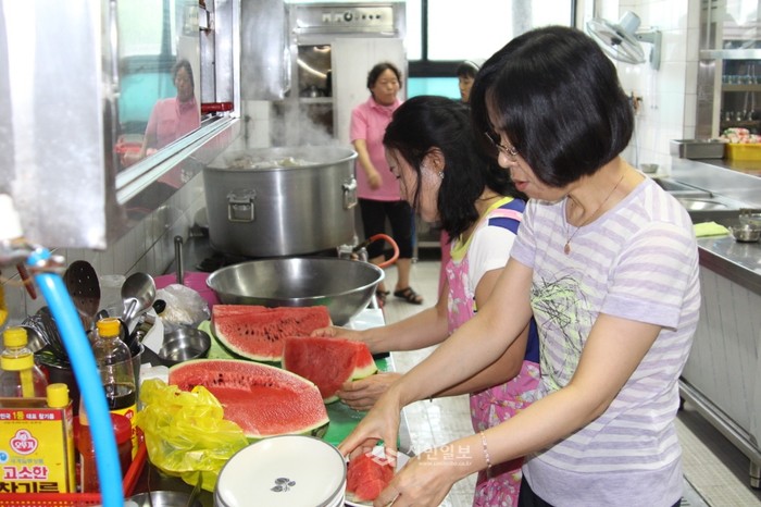 경기 부천소방서와 의용여성소방대는 삼복더위가 지속되는 시기에 각종 화재 및 재난현장에서 수고하는 부천소방서 소방관들에게 건강한 여름나기와 안전한 현장 활동을 당부하기 위해 삼계탕과 함께 부식으로 수박을 제공하는 등 점심식사 봉사활동을 실시했다. (사진제공=부천소방서)