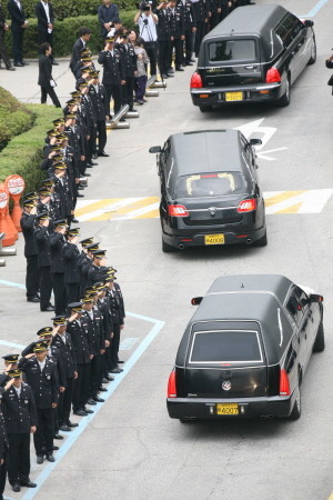 지난 17일 세월호 수색 지원 임무를 마치고 복귀 중 광주 도심에서 헬기 추락사고로 순직한 강원도소방본부 특수구조단 1항공구조대 순직 소방관 정성철(52) 소방령, 박인돈(50) 소방경, 안병국(39) 소방위, 신영룡(42) 소방장, 이은교(31) 소방교 등 5명의 영결식이 22일 오전 강원도청에서 엄수된 가운데 동료 소방관들이 마지막 가는 길을 배웅하고 있다. 이들 소방관들은 영결식후 춘천 동산면 안식원에서 화장돼 국립대전현충원 소방관 묘역에 안장된다.