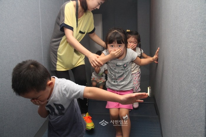 서울 동작소방서는 지난 22일 오전 10시 동작소방서 3층 안전체험교실에서 농심어린이집 어린이들을 대상으로 인형극을 통한 화재예방 및 화재대처요령, 소화기사용법 및 대피체험 등 소방안전교육을 실시했다. 사진은 대피체험을 하고 있는 어린이들의 모습. (사진제공=동작소방서)