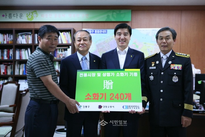 지난 21일 서울상공회의소 강동구상공회가 상대적으로 안전시설이 취약한 전통시장의 화재를 초반에 신속히 진압하고 피해를 줄이기 위한 소화기 240개를 강동구 전통시장 상인연합회에 전달했다. 이 소화기는 전통시장과 상점가에 배치될 예정이다. 사진은 기증식에 참여한 김태진 강동구 전통시장 상인연합회 회장, 전순표 서울상공회의소 강동구상공회 회장, 이해식 강동구청장, 최정열 강동소방서장의 모습.(사진제공=강동구청)