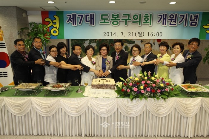 서울 도봉구의회는 제7대 전반기 원구성을 마치고 지난 21일 구의회 3층 홀에서 개원행사를 열고 지역주민을 위해 연구하는 의회, 열린 의정활동 등을 강조하며 새 출발을 다짐했다. 개원행사는 집행부의 이동진 도봉구청장과 집행부 간부들이 참석했으며 조촐한 다과회를 겸했다. 사진은 기념 떡 케이크를 자르고 있는 이 구청장(오른쪽 여섯번째)과 조숙자 의장(오른쪽 일곱번째) 등 의원들의 모습. (사진제공=도봉구의회)