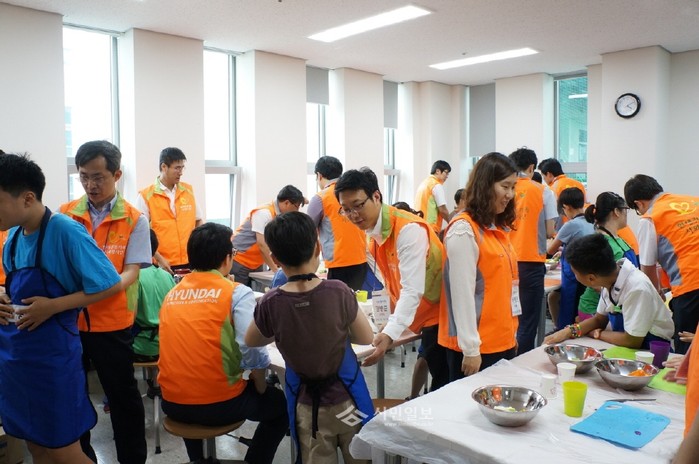 최근 현대건설 사회봉사단 60명 단원들이 서울시립 문래청소년수련관에서 장애청소년들이 학교를 마친 후, 다양한 체험활동을 실시하고 그들의 생활관리를 돕기위해 시범운영 중인 장애청소년방과후아카데미 '희애뜰'을 방문하고 레몬티와 오이피클을 만들어보는 활동에 동참했다. 사진은 봉사단원과 청소년들이 함께 체험활동 중인 모습. (사진제공=서울시립문래청소년수련관)