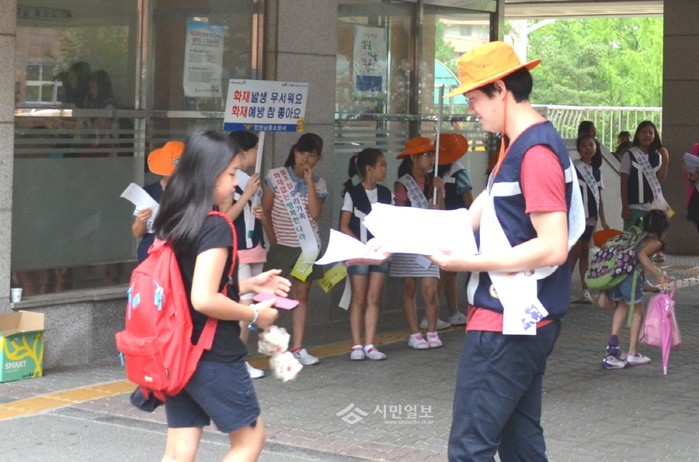 지난 22일 인천 남동서방서 새말초등학교 한국119소년단은 여름방학 기간 중 학생들이 안전하고 즐거운 방학을 보내도록 돕기 위해 어깨띠를 착용하고 안전 예방과 물놀이 안전 수칙 등이 적힌 홍보물을 나눠주는 '안전사고 예방 캠페인'을 실시했다. 사진은 홍보물을 배포 중인 캠페인 참여자의 모습. (사진제공=남동소방서)