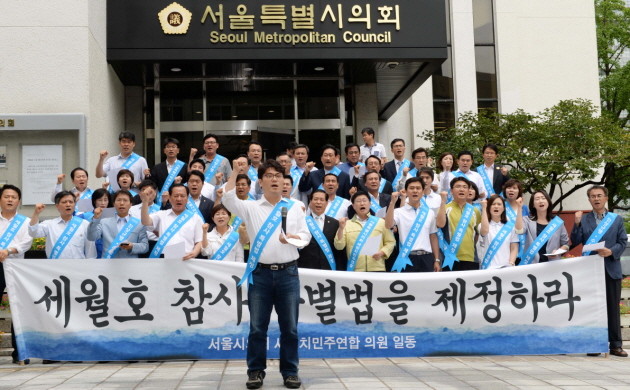 서울시의회 새정치민주연합 소속 의원들이 24일 오후 서울 중구 서울시의회 앞에서 세월호 사건 진상규명과 특별법 제정을 촉구하는 도보행진에 앞서 기자회견을 갖고 있다. 이날 행진은 서소문동 서울시의회에서 출발해 여의도 국회의사당까지 진행된다.