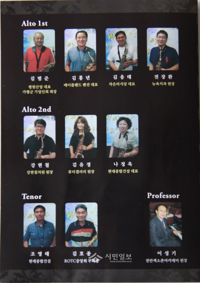 색소폰 앙상블 공존회장 김범준(평원산업 대표, 가평군 기업인회 회장)씨를 비롯한 8명 연주회 회원은 청평면에서 자기 직업을 갖고, 일과 후와 주말에 실력을 키워 왔다는 것이다.