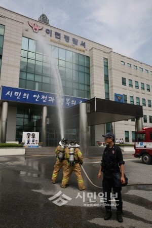 경기 이천경찰서는 28일 이천소방서와 합동으로 경찰서내 화재 발생 상황을 가정하고 대규모 재난대응 능력 향상과 재난 발생시 완벽한 대비체계 구축을 위해 '재난 긴급구조 종합훈련'을 실시했다. 사진은 화재진압 훈련 중인 소방관들의 모습. (사진제공=이천경찰서)