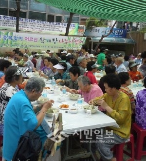 지난 28일 인천 남동구 만수5동 자생단체연합회는 주민자치위원회, 새마을부녀회, 방위협의회 등 10개 관련 단체와 함께 지역노인 300여명을 초청해 삼계탕을 대접했다. 사진은 이날 행사에 참석해 삼계탕을 먹고 있는 노인들의 모습. (사진제공=남동구청)