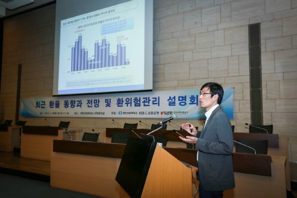 | ▲ 29일 오전 열린 '최근 환율 동향 및 전망과 환위험관리 설명회'에서 외환은행 경제연구팀 서정훈 박사가 최근 환율 동향 및 전망에 대한 강의를 진행하고 있다. | ||