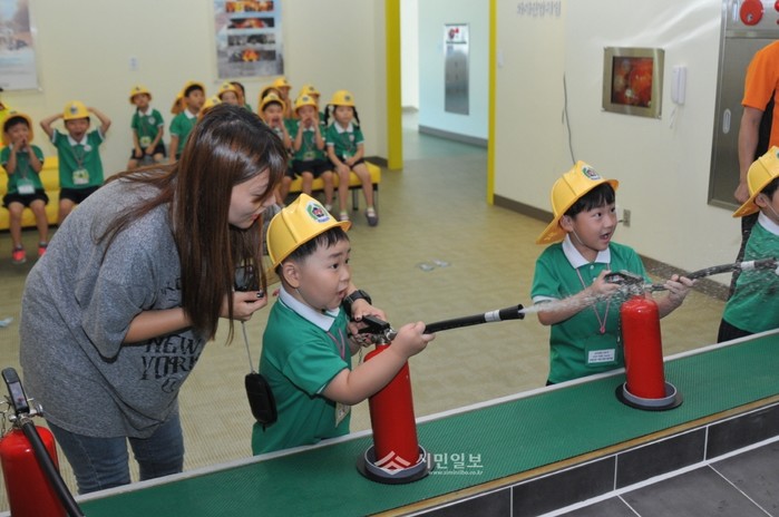 서울 은평소방서는 29일 시민안전체험교실에서 예원사랑 어린이집 원생 및 지도교사 50여명을 대상으로 어린이들의 눈높이에 맞춘 재난대비 소방안전교육을 실시했다. 사진은 이날 교육에 참가한 아이들이 물소화기를 사용해 불을 끄고 있는 모습. (사진제공=은평소방서)