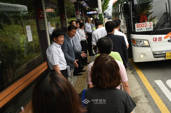 이석우 경기 남양주시장은 30일 직행좌석버스 고속화도로 입석금지에 따른 시민 불편 사항과 문제점을 개선·보완하기 위해 마석지역을 순회하며 현장을 점검했다. 이날 아침 7시 마석역에서 버스이용 승객들의 불편사항을 청취하고, 직접 8002번 직행좌석버스를 이용해 중흥ⓐ~두산ⓐ까지 이동했으며, 배차간격 등 운영상의 문제점을 점검해 개선대책을 세우도록 지시했다. (사진제공=남양주시청)