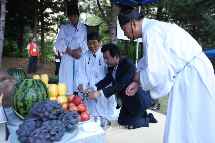 지난 29일 서울 강동구 강일동 벌말근린공원에서 마을의 안녕과 번영을 기원하기 위해 매년 음력 1~3일 중 하루를 선택해 열린 산치성제에 강동구의회 성임제 의장이 참석해 관계자들을 격려하고 축사한 후 직접 제례를 올리며 마을의 풍요와 주민들의 화합을 기원했다. (사진제공=강동구의회)