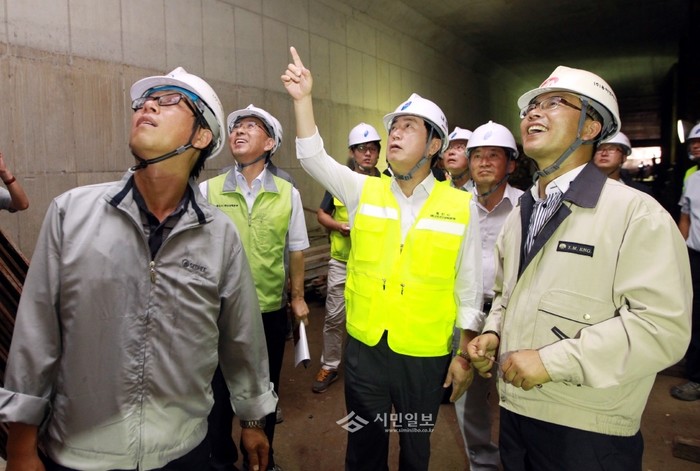 지난 30일 정찬민 경기 용인시장이 여름철 풍수해 피해를 최소화하고 비상근무체계 점검을 위해 지역내 상현교차로 개선사업 공사현장을 직접 방문해 공사관계자들과 함께 현장을 둘러보며 대비 태세를 점검하고 있다. (사진제공=용인시청)