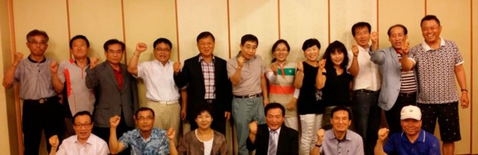 그동안 활동이 저조해 유명무실한 전북 김제시 재경봉남면향우회가 서울 방이동 한 음식점에서 새로 결성하는 구성협의를 갖고 본격 활동에 앞서 김영용 봉남면장 등과 함께 임원진들이 파이팅을 외치고 있다.
