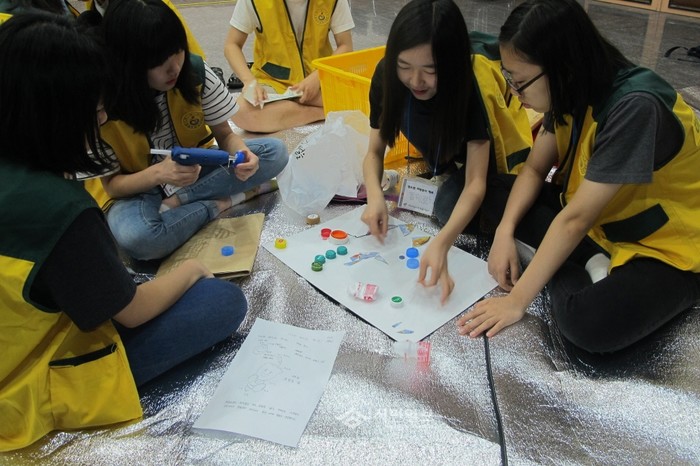 지난달 31일 경기 하남시 자원봉사센터가 지역내 중고생 450여명을 대상으로 자원봉사기초교육과 특별체험으로 구성된 '청소년 자원봉사학교'를 열었다. 사진은 총 3기로 진행된 특별체험 중 진행된 제2기 '정크아트 만들기'에 참여한 청소년들이 쓰레기를 활용한 작품을 만들어보는 모습. (사진제공=하남시청)