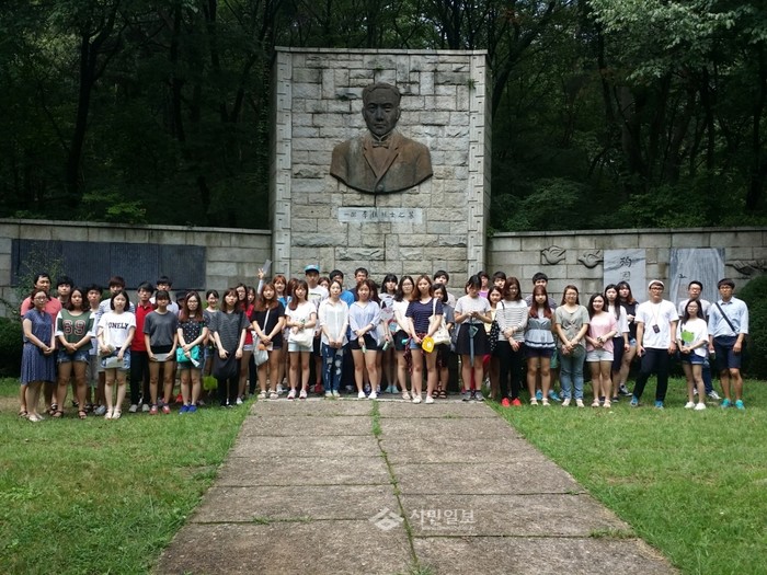 서울 강북구는 지난 7월31일 구청 대학생 아르바이트 50명과 함께 지역내 역사문화 탐방을 실시했다. 탐방코스는 국립 4.19민주묘지, 일성 이준 열사 묘역, 3.1운동의 발원지 우이동 봉황각 등이었다. 사진은 이준 열사 묘역 앞에서 기념촬영을 하는 모습. (사진제공=강북구청)