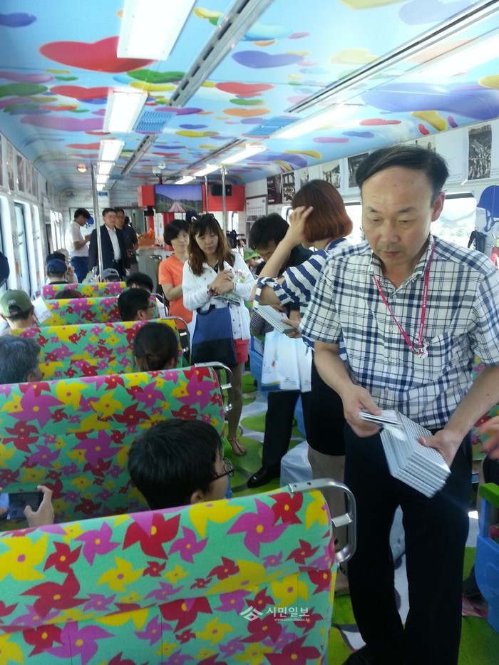 1일 경기 동두천시는 동두천역의 협조를 얻어 서울역을 출발해 백마고지로 가는 '경원선 평화열차 DMZ 트레인'이 동두천역에서 정차하는 시간을 이용해 탑승객들에게 자체 체작한 부채 및 손수건 등 시의 문화관광 홍보물을 배부했다. (사진제공=동두천시청)