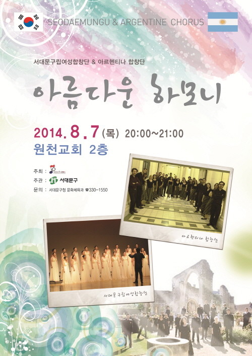 '아름다운 하모니'란 부제를 단 이번 공연은 4부로 구성돼 아르헨티나 합창단, 서대문구립여성합창단, 그리고 두 합창단의 협연무대를 골고루 감상할 수 있다.