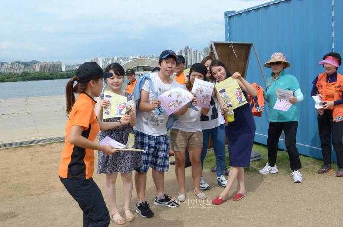 지난 2일 서울 영등포소방서가 여의도 한강공원내 캠핑장에서 캠핑 중 부탄가스 사용으로 인한 사고 발생을 예방하기 위해 캠핑장 이용객들을 대상으로 부탄가스캔 안전사용요령, 레저용 LPG용기 안전사용요령 등을 홍보하고 홍보전단지를 배포했다. 사진은 홍보물을 전달 중인 소방관과 이를 받아든 시민들의 모습. (사진제공=영등포소방서)