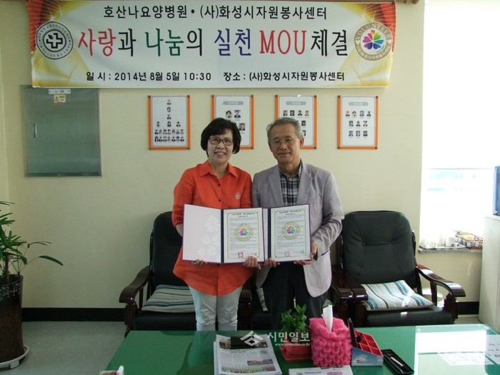 경기 (사)화성시자원봉사센터는 5일 센터 이사장실에서 호산나요양병원과 양 기관이 가지고 있는 전문성과 장점을 활용해 지역내 소외된 어려운 이웃을 돕기로 하고 협약을 체결했다. 사진은 이날 협약식에 참석한 양 기관 관계자들의 모습. (사진제공=화성시자원봉사센터)