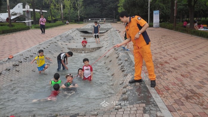 5일 오후 서울 동작소방서가 보라매공원에서 공원을 찾은 시민과 어린이들을 대상으로 물놀이를 안전하게 즐길 수 있도록 하기 위한 안전교육을 실시했다. 이 교육은 오는 8월 말까지 매주 화요일 진행될 예정이다. 사진은 소방관과 함께 물에 빠졌을 때의 구조방법을 체험 중인 어린이들의 모습.(사진제공=동작소방서)