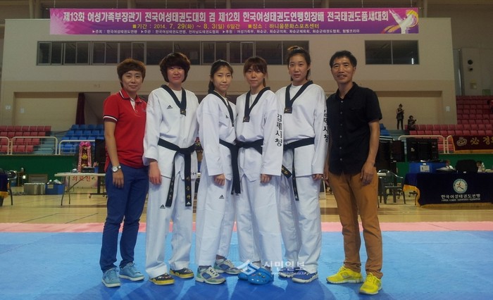 전북 김제시청 태권도팀이 최근 전남 화순 하니움문화스포츠센터에서 열린 '제13회 여성가족부 장관기 전국 여성 태권도대회'에서 금메달 1개·은메달 3개를 획득하며 개인종합 3위를 차지하는 영예를 안고 환하게 웃고 있다. (사진제공=김제시청)