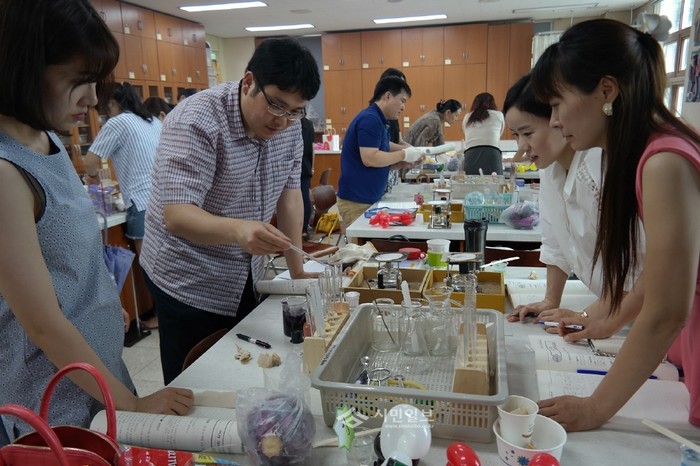 지난 5일 경기 광주하남교육지원청이 지역내 초등학교 교사 24명을 대상으로 8일까지 실시하고 있는 '2014초등과학 실험지도 역량강화 직무연수'에 참가한 교사들이 과학탐구실험을 하고 있다. (사진제공=광주하남교육지원청)