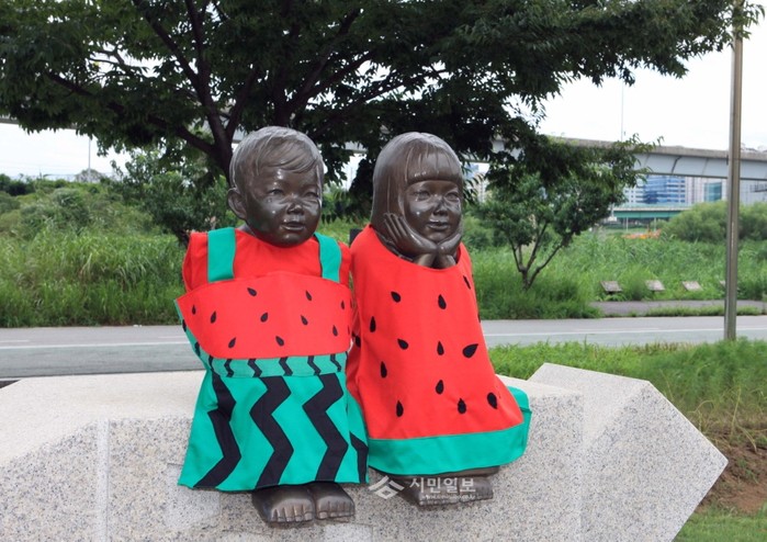 성동구(구청장 정원오) 살곶이공원 남매상 ‘여울이’와 ‘가람이’가 무더위를 시원하게 날려줄 수박옷을 입었다. 남매상의 옷은 한양여대 패션디자인학과 동아리 ‘패크레’에서 재능기부로 계절이나 기념일에 맞춰 다양하게 만들어서 제공하고 있다.(사진제공=성동구청)