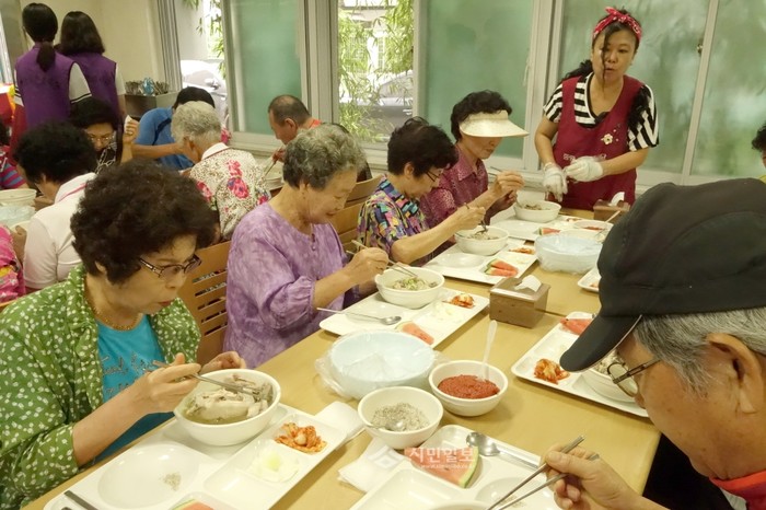 서울 중랑구의 중랑사랑봉사나눔회는 지난 11일 신내동에 위치한 신내노인복지관을 찾아 어려운 이웃과 노인 등 600명을 초청해 삼계탕을 대접했다. 이날 행사에는 중랑사랑봉사나눔회 회원들 외에도 학생 20명과 중랑구청 봉사센터 직원 등이 함께했다. (사진제공=중랑사랑봉사나눔회)
