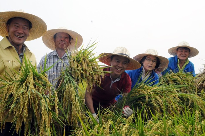 12일 전북 전주시 호성동 하오마을에 위치한 신동선씨(57) 농가의 논(2만㎡)에서 올해 첫 조생종 벼 수확이 김승수 전주시장(왼쪽 세번째)과 박현규(왼쪽 첫번째) 전주시의장 등 농민들이 참여한 가운데 실시됐다.