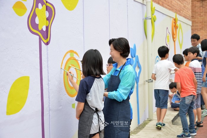 13일 서울 양천구 신월3동 서울SOS어린이마을 담장에 주민참여예산 사업을 통해 확보된 예산으로 추진하는 '밝은 웃음꽃이 흐르는 달맞이 마을'을 주제로 한 벽화그리기 사업에 마을 아동과 인근 주민들이 직접 참여해 벽화 그리기 작업을 했다. 사진은 직접 벽화를 그리는 김수영 구청장과 아동들의 모습. (사진제공=양천구청)