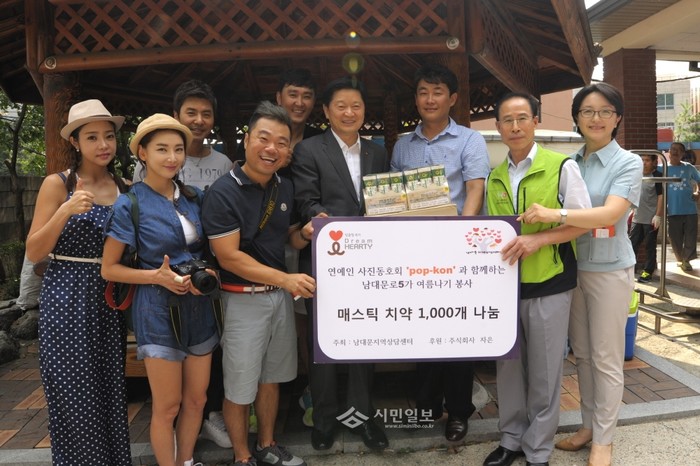 지난 12일 최창식 중구청장이 남대문로5가 경로당 앞에서 연예인 사진동호회 ‘팝콘’ 회원으로부터 치약 1000개를 전달받고 기념촬영을 한 후, 남대문 쪽방에 거주하는 거동 불편 4가구에 배달봉사를 실시했다. (사진제공=중구청)