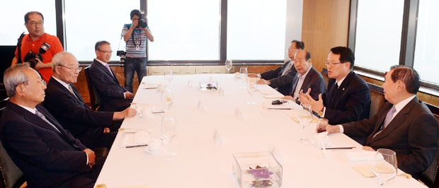 17일 오후 정의화 국회의장이 서울 여의도 한 식당에서 전직 국회의장들을 초청, 오찬을 함께하고 있다. 이 날 오찬에는 박희태, 김원기 전 의장, 정의화 국회의장, 박관용, 김수한, 정래혁, 김형오 전 의장이 참석했다.