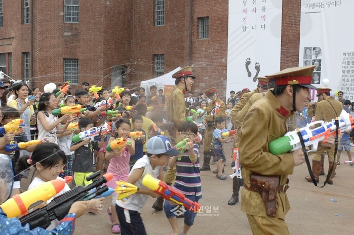 지난 15일 서울 서대문구의 대표축제로 자리잡은 '서대문독립민주축제'의 행사 중 하나인 '독립군 對 순사 물총싸움'이 열린 서대문형무소 역사관 광장에서 일제순사복장을 한 참가자들이 물총세례를 받고 있다. (사진제공=서대문구청)