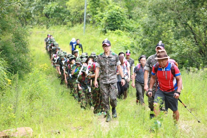 서울 강북구는 중학교 2학년 학생들로 구성된 청소년 희망 원정대를 대상으로 강원 인제군에 위치한 육군 제12사단에서 최근 2박3일간의 '병영체험 여름캠프'를 실시했다. 사진은 청소년 희망 원정대와 엄홍길 대장이 산행을 하는 모습. (사진제공=강북구청)