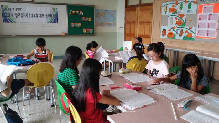[시민일보=시민일보 기자]경기 부천시 석천초등학교는 최근 부천교육지원청의 지원 예산으로 '세계를 내 품 안에, 2014 영어뮤지컬&다문화체험 여름캠프'를 실시했다. 사진은 이날 캠프에 참가한 학생들이 수업을 듣고 있는 모습. (사진제공=부천교육지원청)