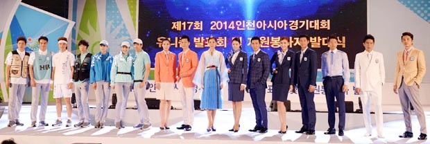 19일 오후 인천삼산월드체육관에서 열린 2014 인천아시아경기대회 유니폼발표회 및 자원봉사자 발대식 리허설에서 자원봉사자들이 유니폼을 입고 포즈를 취하고 있다.
