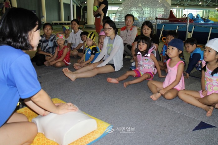 지난 20일 인천시 남구 드림스타트가 일산 호수공원 청개구리 물놀이 체험장에서 진행한 '물놀이 체험 및 안전교육' 행사에 참가한 미취학 아동과 부모들이 안전수칙과 심폐소생술 등 안전사고 예방교육을 받고 있다. (사진제공=남구청)