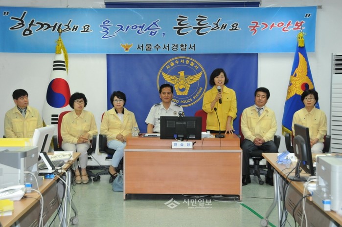 지난 19일 김명옥 서울 강남구의장은 ‘2014년 을지연습’ 참여 공직자들의 노고를 격려하고, 각종 도상훈련 상황을 참관하기 위해 강남구의회 의장단과 함께 서울 수서경찰서 을지연습 상황실을 방문, 직원들의 노고를 치하하고 격려했다. (사진제공=강남구의회)