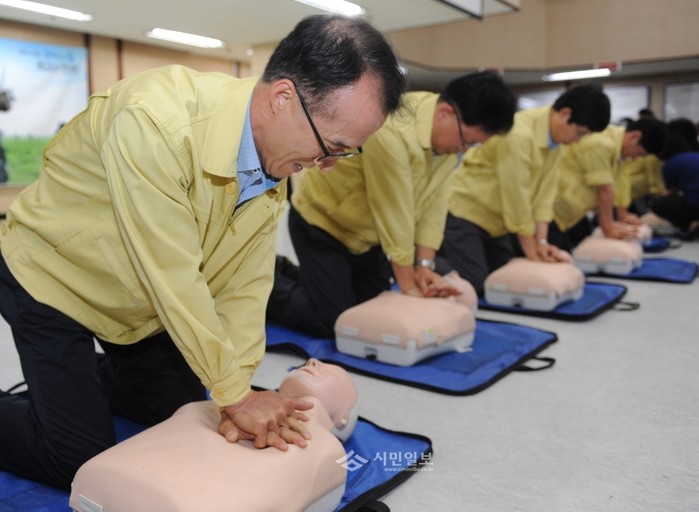 21일 서울 송파구청 을지상황실에서 을지연습 4일차를 맞아 구청 간부들이 전시 비상사태 대비훈련의 일환으로 심폐소생술 교육을 받고 있다. 사진은 서명호 홍보과장과 직원들이 심폐소생술 실습을 실시하는 모습. (사진제공=송파구청)