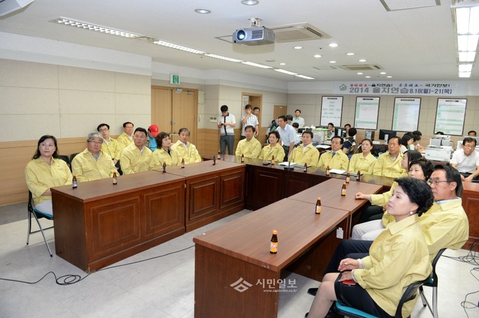 서울 중랑구의회 의원들은 을지연습 기간인 지난 20일 구청 을지연습상황실을 방문해 훈련상황을 참관하고 위문품을 전달하는 등 관계공무원과 군부대 장병 등 훈련 참가자들을 격려했다. 사진은 상황실에서 훈련상황을 참관하고 있는 의원들의 모습. (사진제공=중랑구의회)