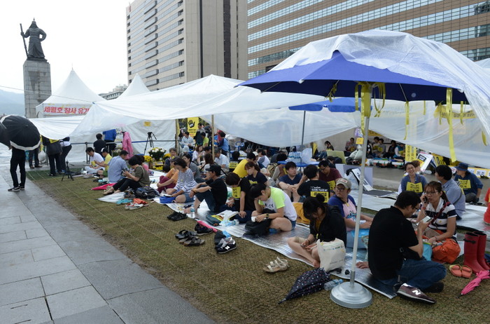 21일 오후 서울 광화문광장에서 세월호 참사 특별법 제정을 촉구하는 단식농성장에 시민들이 모여들어 동참하고 있다.