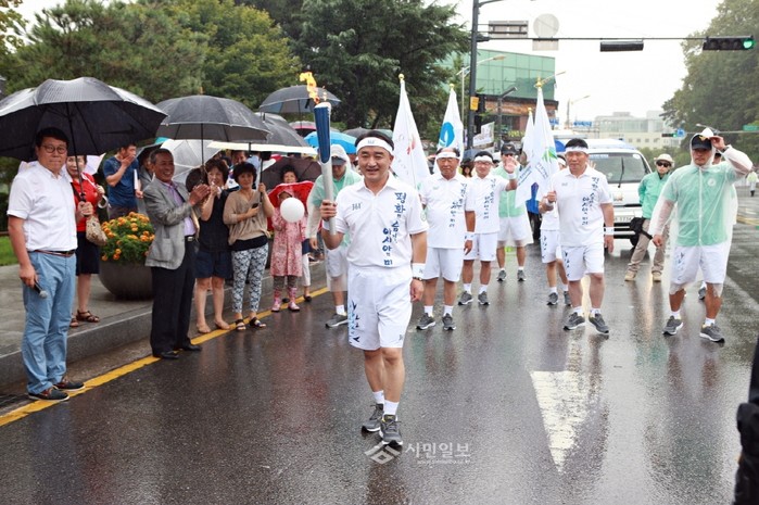 21일 황은성 안성시장이 45명의 시민들과 함께 '2014 인천아시아경기대회'의 시작을 알리는 성화봉송 행사에 참여해 첫번째 주자로 나서 시민들과 함께 성화를 들고 달리고 있다. (사진제공=안성시청)