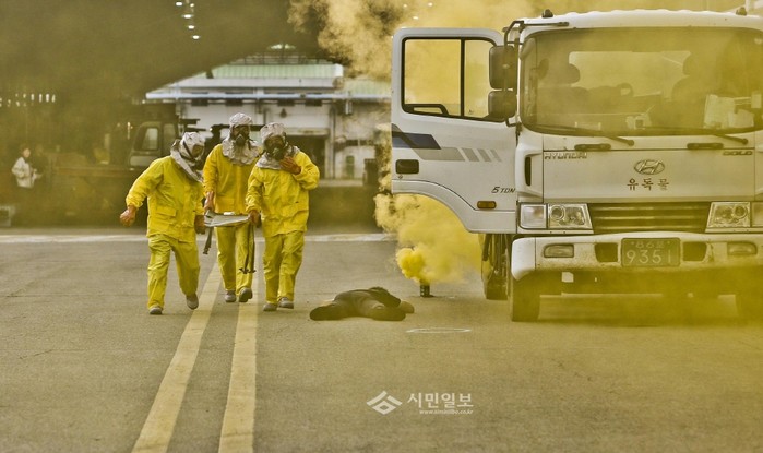 최근 인천 계양구는 '2014년 을지연습'과 연계한 '제395차 민방위 날 민방공 대피훈련' 및 유해화학물질 누출에 따른 사태수습 훈련을 실시했다. 사진은 유독물이 누출된 상황을 가정한 사태수습 훈련 모습. (사진제공=계양구청)