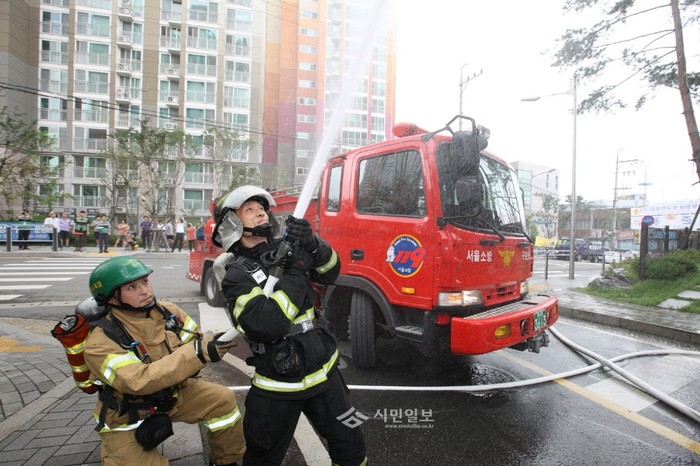 서울 금천구는 최근 대규모 아파트단지에 적포탄이 낙하, 아파트 4동이 파괴되고 화재가 발생해 인명·재산피해가 발생한 상황을 설정하고 을지연습 실제훈련을 실시했다. 사진은 아파트 화재를 진압하는 훈련 중인 소방대원의 모습. (사진제공=금천구청)