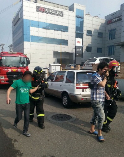 22일 오후 인천 남동구 남동공단 전자회로기판 공장에서 염소산나트륨가스가 유출되는 사고가 발생, 소방관들이 주변 관계자들을 이동시키고 있다. 이 사고로 주변에 있던 22명이 구토와 두통 증세를 호소해 근처 병원으로 옮겨졌으며, 경찰과 소방당국은 전자기판 세척제가 폐기물에 투입되면서 가스가 나온 것으로 보고 정확한 피해 규모를 조사하고 있다.
