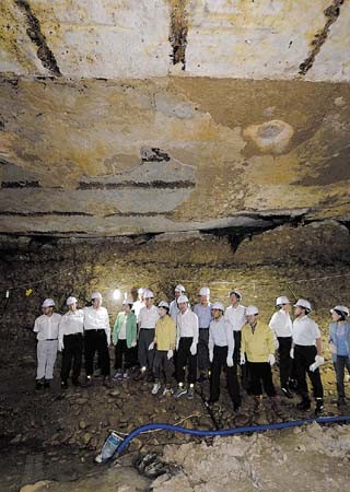새누리당 김무성 대표와 의원들이 22일 송파구 석촌 지하차도 싱크홀 현장을 방문해 대책을 보고 받고 있다.