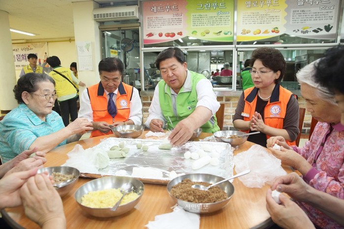 | ▲ 지난해 엘림요양원을 방문해 함께 송편을 만들며 봉사활동에 참여중인 조길형 구청장과 직원들의 모습.(사진제공=영등포구청) | ||